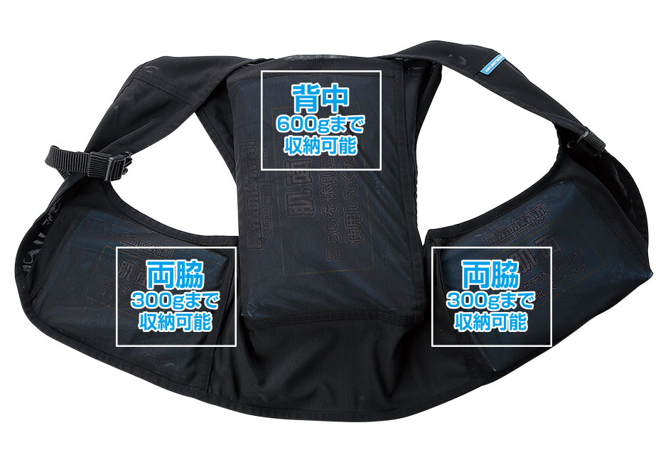 背中と両脇に保冷剤用ポケットを装備したメッシュベスト