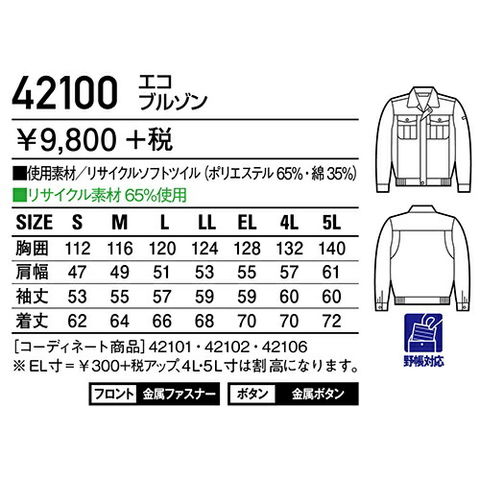 作業服 ブルゾン 作業着 ジャケット 制電 帯電防止 エコマーク認定 グリーン購入法対応 野帳対応 ジャンパー ジャンバー 上着 長袖 通年 秋冬 自重堂 42100 おしゃれ かっこいい 人気 企業 法人 作業 ユニフォーム 仕事 土木 工事 現場 大きいサイズ 4L 5L