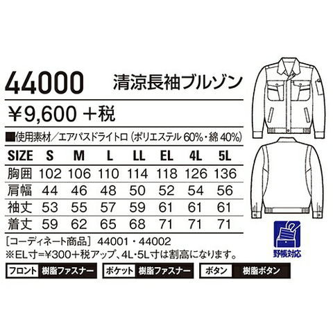 自重堂 作業服 44000 長袖ブルゾン 春夏 メンズ 作業着 ワークウエア