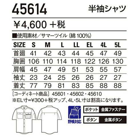 自重堂 作業服 45614 半袖シャツ 春夏 メンズ 作業着 半袖 ワークウエア