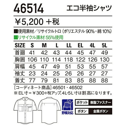 自重堂 作業服 46514 半袖シャツ 春夏 メンズ 作業着 半袖 ワークウエア