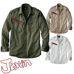 ソフトな風合いと独特の織柄が特長のミリタリー調ワークウエア。アクセントの肩章や胸ポケットでハードなイメージ。消臭・抗菌効果のあるDEO+テープやダブルポケットなど付加価値が高い商品。