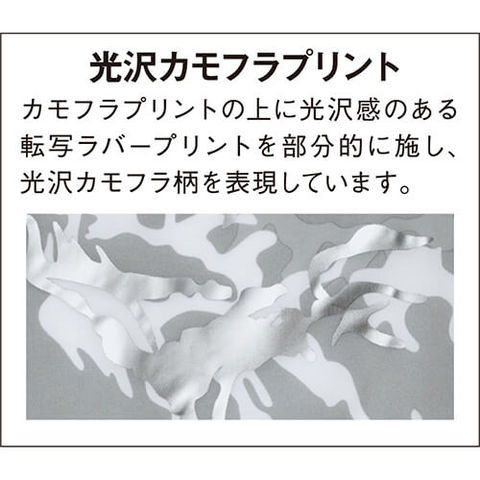 | ・光沢カモフラプリント カモフラプリントの上に光沢感のある転写ラバープリントを部分的に施し、光沢カモフラ柄を表現しています。 ・デニム柄プリント デニム調のプリントを施し、デニム柄を表現しています。 |