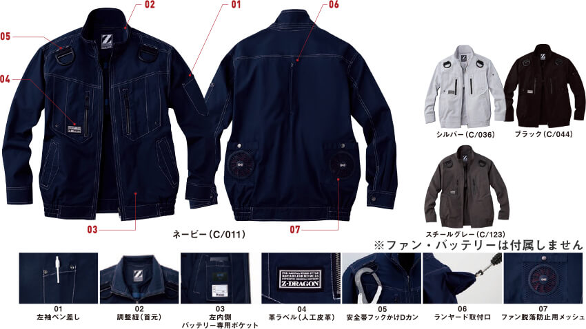 | フロント:金属ファスナーポケット:金属ファスナー ボタン:金属ボタン ランヤード取付け口:樹脂ファスナー 左袖ペン差し 調整ヒモ(首元) 左内側バッテリー専用ポケット 安全帯フックかけD環 ランヤード取付け口 ファン脱落防止用メッシュ |