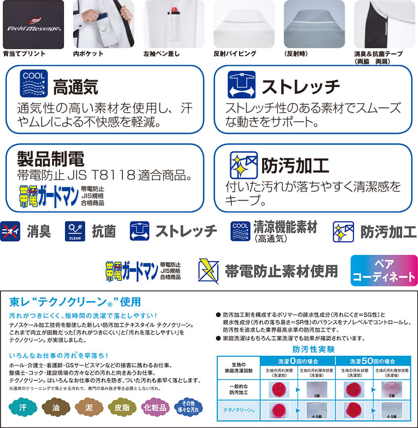 | 製品制電のワークウェアです。 カラー豊富で男女兼用シリーズだからユニフォームにも最適! 東レ【テクノクリーン】使用 ・汚れがつきにくく、短時間の洗濯で落としやすい! ナノスケール加工技術を駆使した新しい防汚加工テキスタイル テクノクリーン これまで両立が困難だった「汚れがつきにくい」と「汚れを落としやすい」をテクノクリーンが実現しました。 ・いろんなお仕事の汚れを早落ち! ホール・介護士・看護師・GSサービスマンなどの接客に携わるお仕事。 整備士・コック・建設現場の方々などの汚れと向き合うお仕事。 的のクリーンはいろんなお仕事の汚れを防ぎ、ついた汚れも素早く落とします。※通常のクリーニングで落とせる汚れで、専門の染み抜きなどを必要としない汚れ。 |