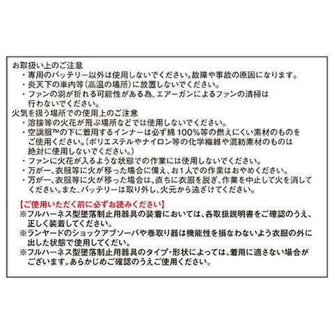 ・空調服の下に着用するインナーは必ず綿100%等の燃えにくい素材のものをご使用ください。