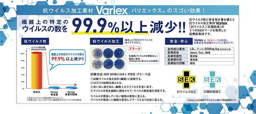 抗ウイルス性と安全性を兼ね備えた抗ウイルス加工素材「バリエックス」は「抗ウイルス」「抗菌防臭」の2つのSEKマークを取得した高機能素材です。