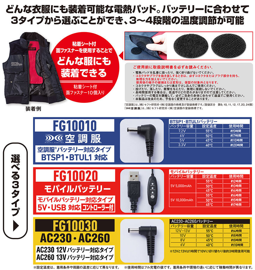 バッテリーに合わせて3タイプから選ぶことができ、3~4段階の温度調節可能