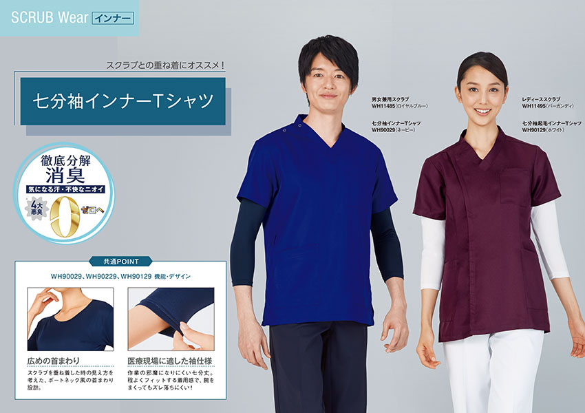 | 七分袖インナーTシャツに消臭&接触冷感素材のインナーが登場!ストレッチ性があり動きやすく、スクラブ、ポロシャツ着用時のインナーとしてコーディネイトできる商品。消臭糸を使用しているので、半永久的に消臭効果が持続!気になる汗などのニオイを抑制します。さらに、吸汗速乾加工に加えて、ひんやりとする接触冷感性、UVカット付の素材なので、暑い時期にオススメのインナーです。 |