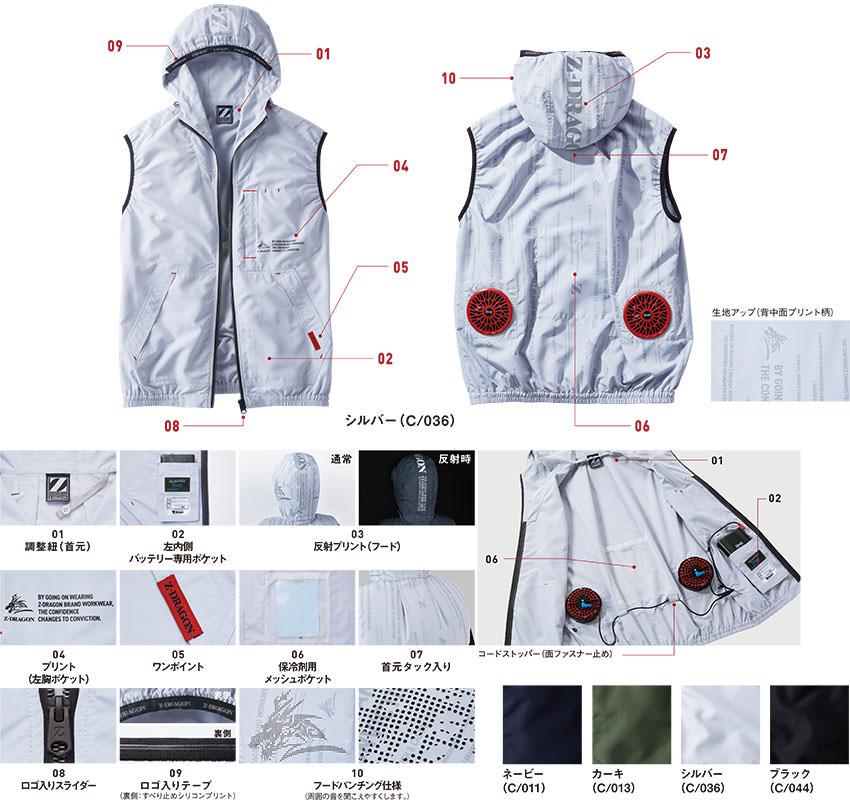 首元調整紐、左内側バッテリー専用ポケット、フード反射プリント、左胸ポケットプリント、ワンポイント、保冷剤用メッシュポケット、首元タック入り、ロゴ入りスライダー、ロゴ入りテープ(裏側:すべり止めシリコンプリント)、フードパンチング仕様(周囲の音が聞こえやすくします)、コードストッパー面ファスナ止め