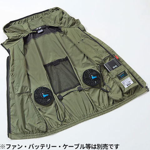 首元調整紐、左内側バッテリー専用ポケット、フード反射プリント、後右肩反射プリント、保冷剤用メッシュポケット、ロゴ入りスライダー、ロゴ入りテープ(裏側:すべり止めシリコンプリント)、フードパンチング仕様(周囲の音が聞こえやすくします)、コードストッパー面ファスナ止め、袖口紐通し穴