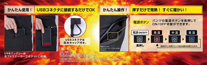 | 電源ボタン(左ファスナーカーゴポケット内)、ワンポイント、バッテリー収納ポケット、USBケーブル(コネクタ)、保温性の高いブラックアルミメッシュ裏地使用、ウエスト紐 |