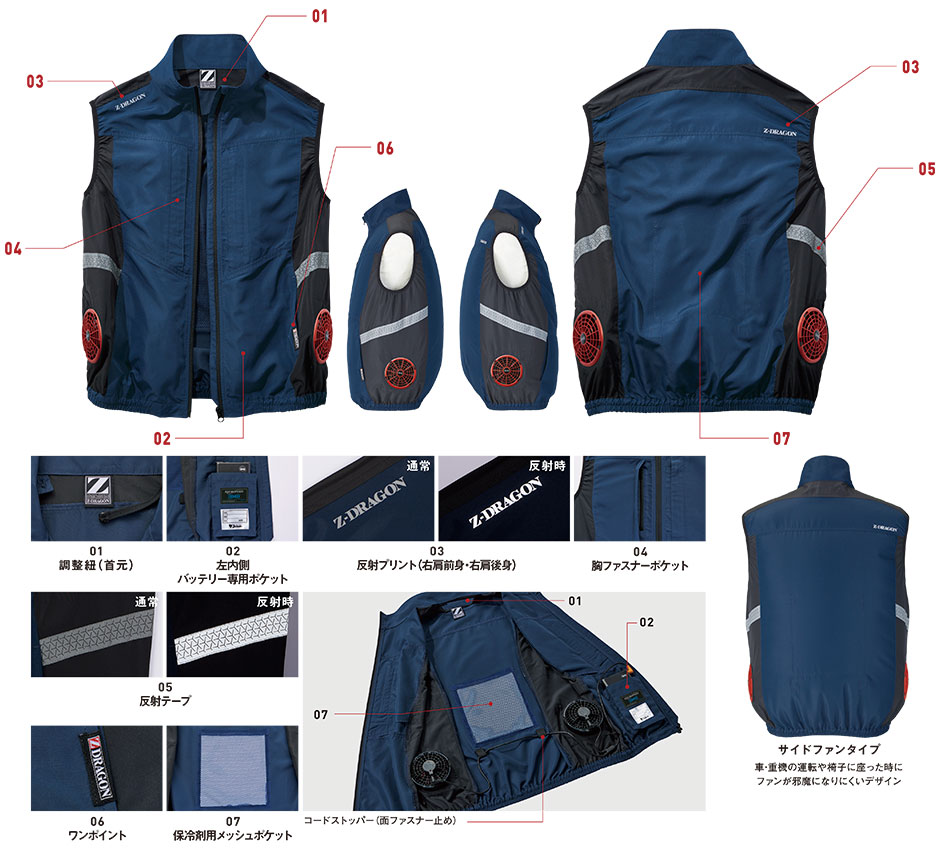 調整紐(首元)左内側バッテリー専用ポケット、反射プリント(右肩前身・右肩後身)、反射テープ、縦ファスナーポケット、ワンポイント、保冷剤用メッシュポケット、コードストッパー(面ファスナー止め)、サイドファンタイプ