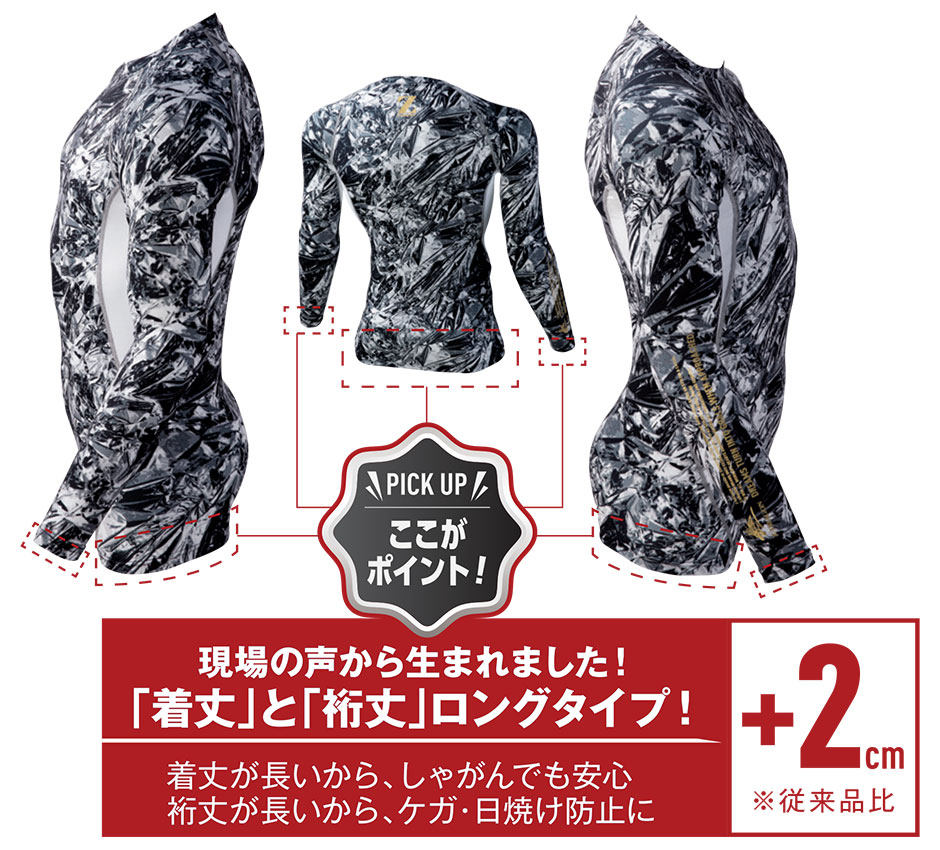 | 吸汗速乾、消臭・抗菌の機能も持ち合わせ右袖のブランドロコプリントが個性を主張するコンプレッションインナー プラス2cm(従来品比)「着丈」と「桁丈」ロングタイプ! 着丈が長いからしゃがんでも安心 桁丈が長いからケガ・日焼け防止 |