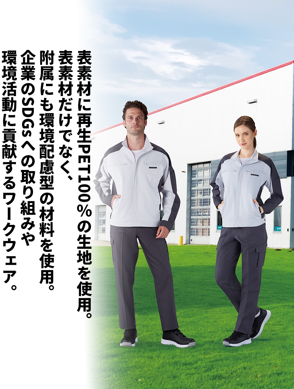 表素材に再生PET繊維を100%使用、環境にやさしいワークウエア