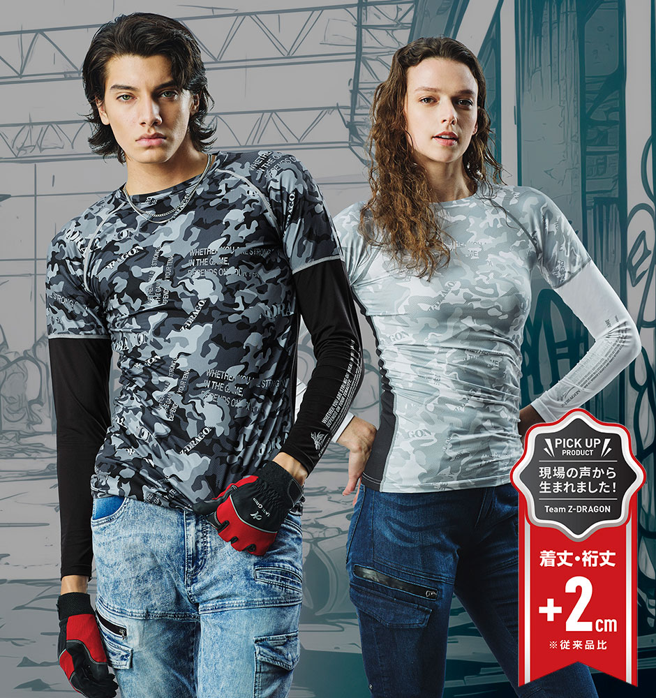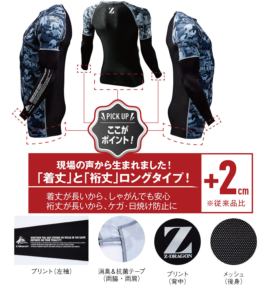 | 現場の声から生まれました!着丈・桁丈+2cm(従来品比) 吸汗速乾、消臭&抗菌の機能も持ち合わせたカモフラ柄が魅力のコンプレッションインナー |