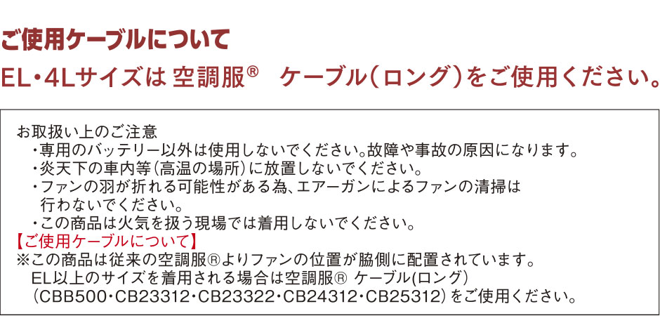| この商品は従来の空調服よりファンの位置が脇側に配置されています。 EL以上のサイズを着用される場合は空調服ケーブル(ロング)をご使用ください。 |