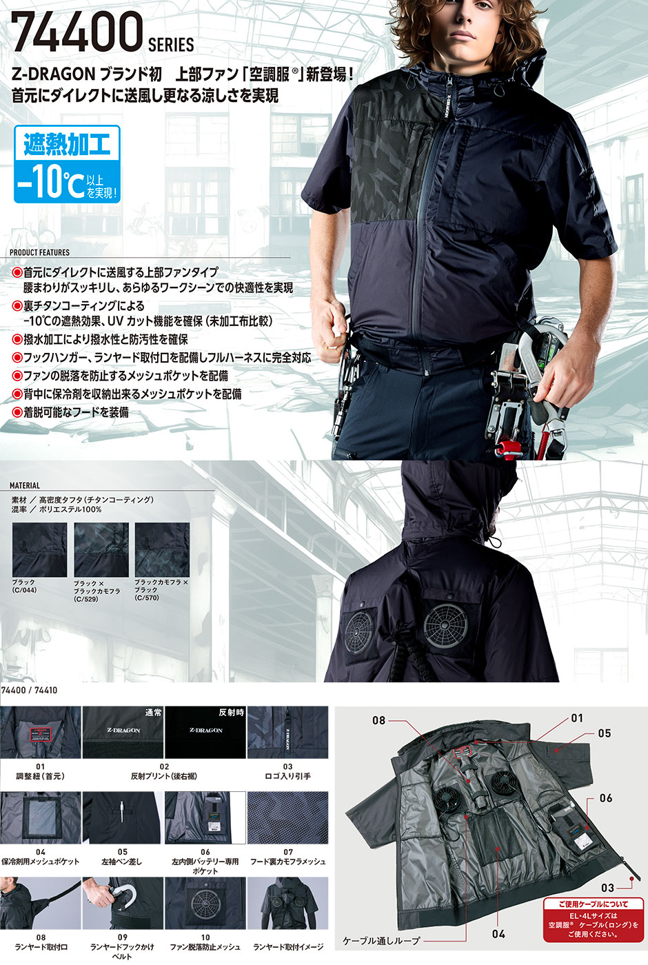 遮熱加工-10℃以上、上部ファン、フルハーネス対応、首元調整紐、反射プリント(後右裾)、ロゴ入り引き手、左袖ペン差し、左内側バッテリー専用ポケット、保冷剤用メッシュポケット、フード裏カモフラメッシュ、ランヤード取出し口、ランヤードフックかけベルト、ファン脱落防止メッシュ