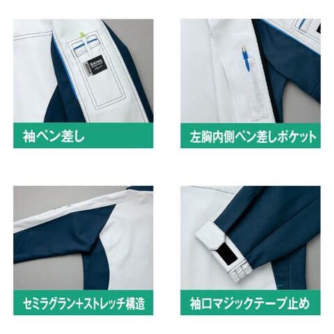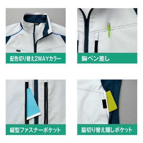 配色切替2WAYカラー、左胸ペン差し、縦形ファスナーポケット、脇切り替え隠しポケット、左袖ペン差し、左胸内側ペン差しポケット、セミラグラン+ストレッチ構造、袖口マジックテープ止め、反射パイピング仕様、ウエストマジックテープ止め、ファスナー:コイル(スライダー:金属)、ポケットファスナー:コイル(スライダー:金属)