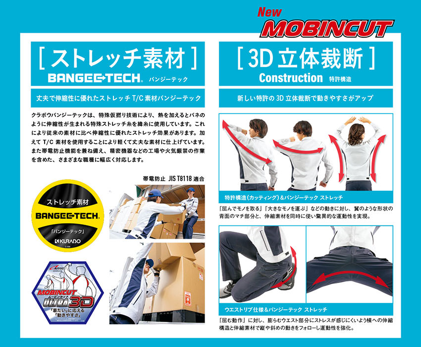 | ・伸縮性があり動きやすく作業効率があがる、生地が伸びる、しゃがむことが多い現場に最適です。 ・ムレない、ムレにくい、熱とムレを逃がす。 |