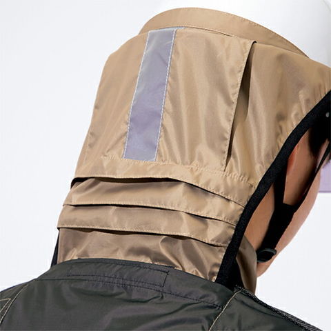 | 「スペーサーパッド(別売)」対応。別売のスペーサーパッドを装着することにより超3Dメッシュが墜落制止用器具の圧力が加わる箇所に「空気の道」を作り衣服内に空気を循環させます。 「遮熱シェード」装備。空調服の首元から排出される風を効率よくヘルメット内へ導入し頭部を冷却できます。内側はチタンコーティングが施され遮熱効果が高く、高温時の熱中症対策としても効果が期待できます。 |