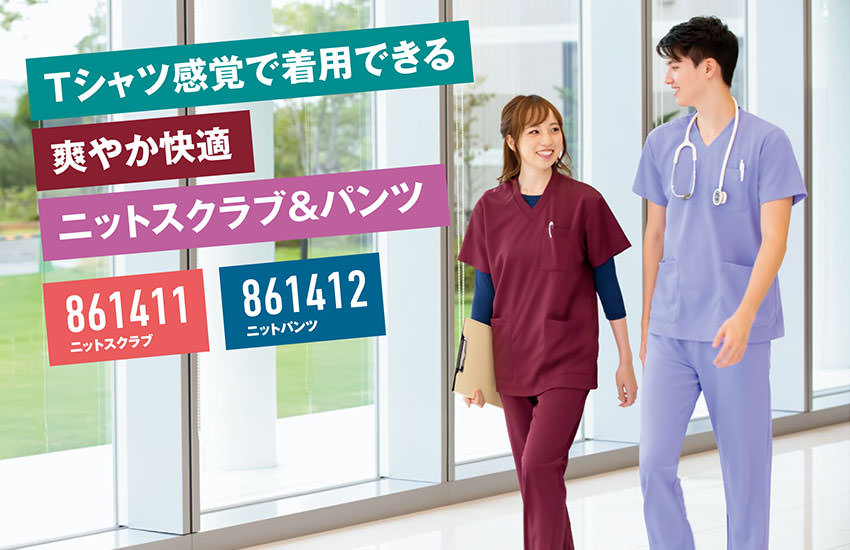 Tシャツ感覚で着用できる爽やか快適「ニットスクラブ&パンツ」