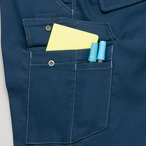 | 股割り仕様(しゃがんでの作業をつっぱらずに快適に) 左右のカーゴポケットはフラップに反射パイピングを装備 ペン差し付で充分な収納力のカーゴポケット |