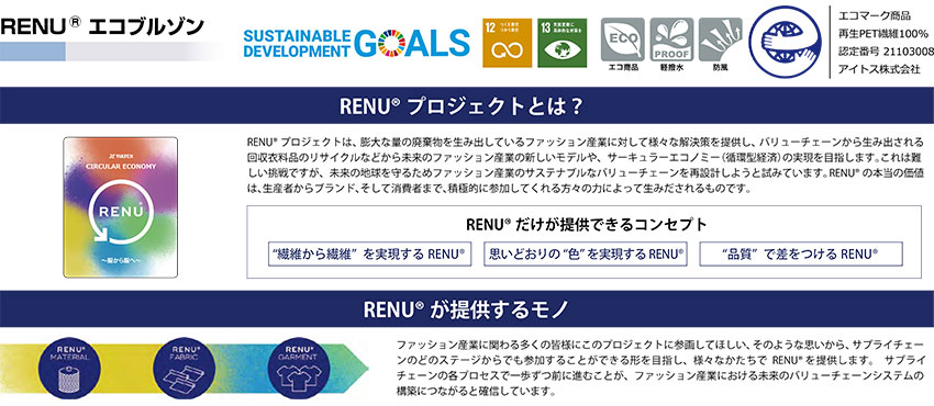 大な量の廃棄物を生み出しているファッション産業に対して様々な解決策を提供し、バリューチェーンから生み出される回収衣料品のリサイクルなどから未来のファッション産業の新しいモデルや、サーキュラーエコノミー(循環型経済)の実現を目指します。これは難しい挑戦ですが、未来の地球を守るためファッション産業のサステナブルなバリューチェーンを再設計しようと試みています。RENUの本当の価値は、生産者からブランド、そして消費者まで、積極的に参加してくれる方々の力によって生みだされるものです。