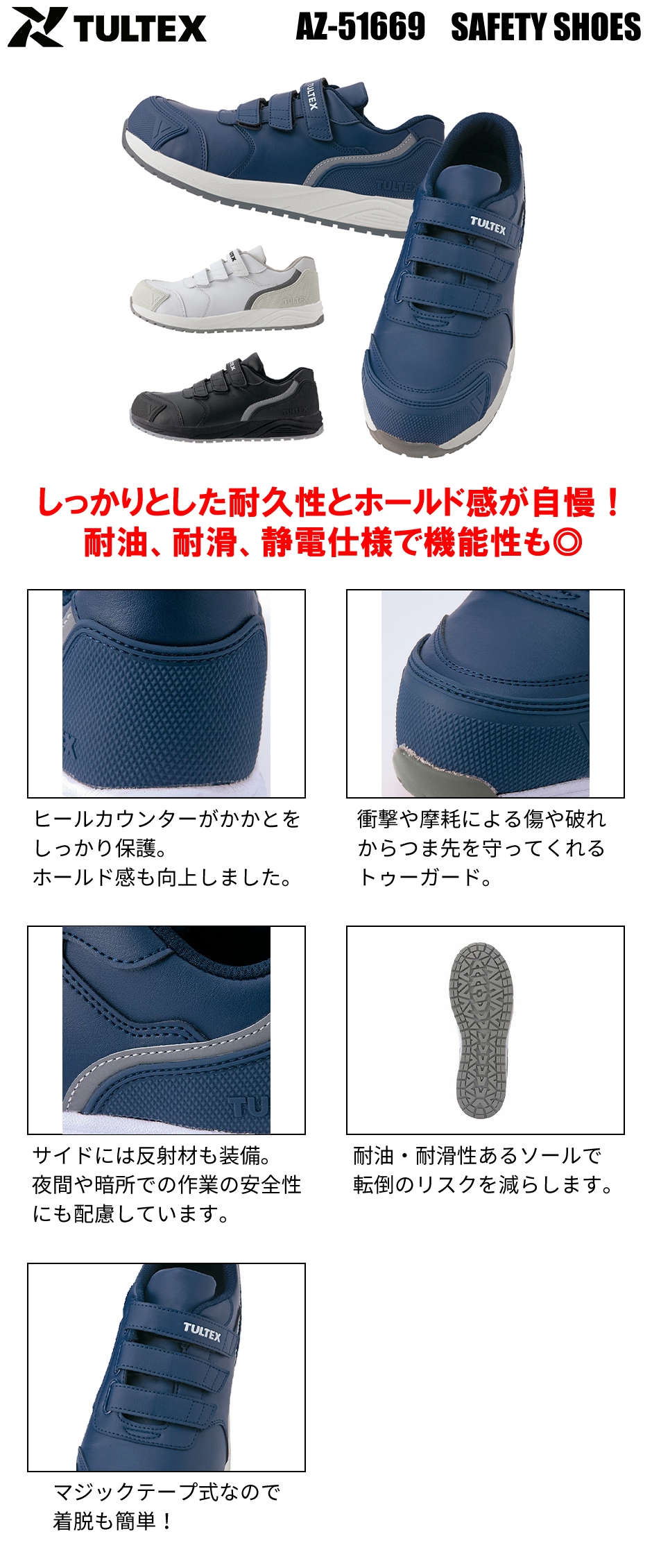 オリジナルのトゥーガードとヒールカウンターによる耐久性とホールド感、着脱がしやすいマジック仕様の耐油、耐滑、静電モデル