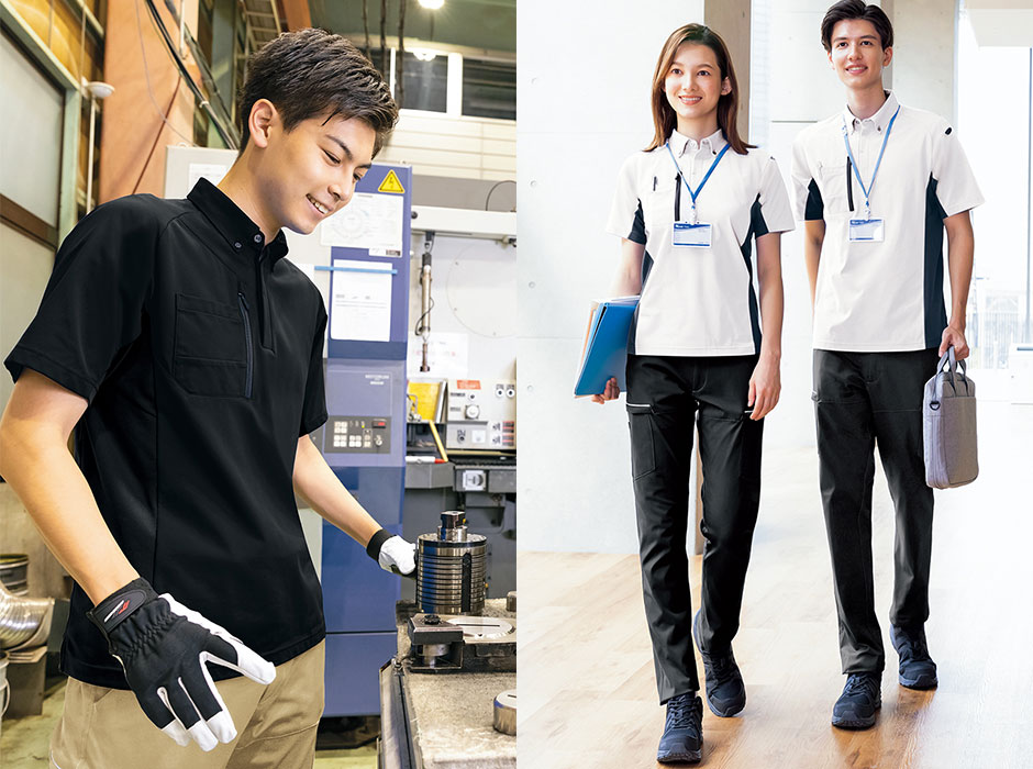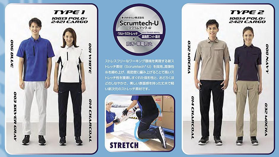 ワーキングウエアに最も重要な要素の一つであるストレスフリーを実現する新次元のストレッチ素材(Scrumtech-U) を採用。