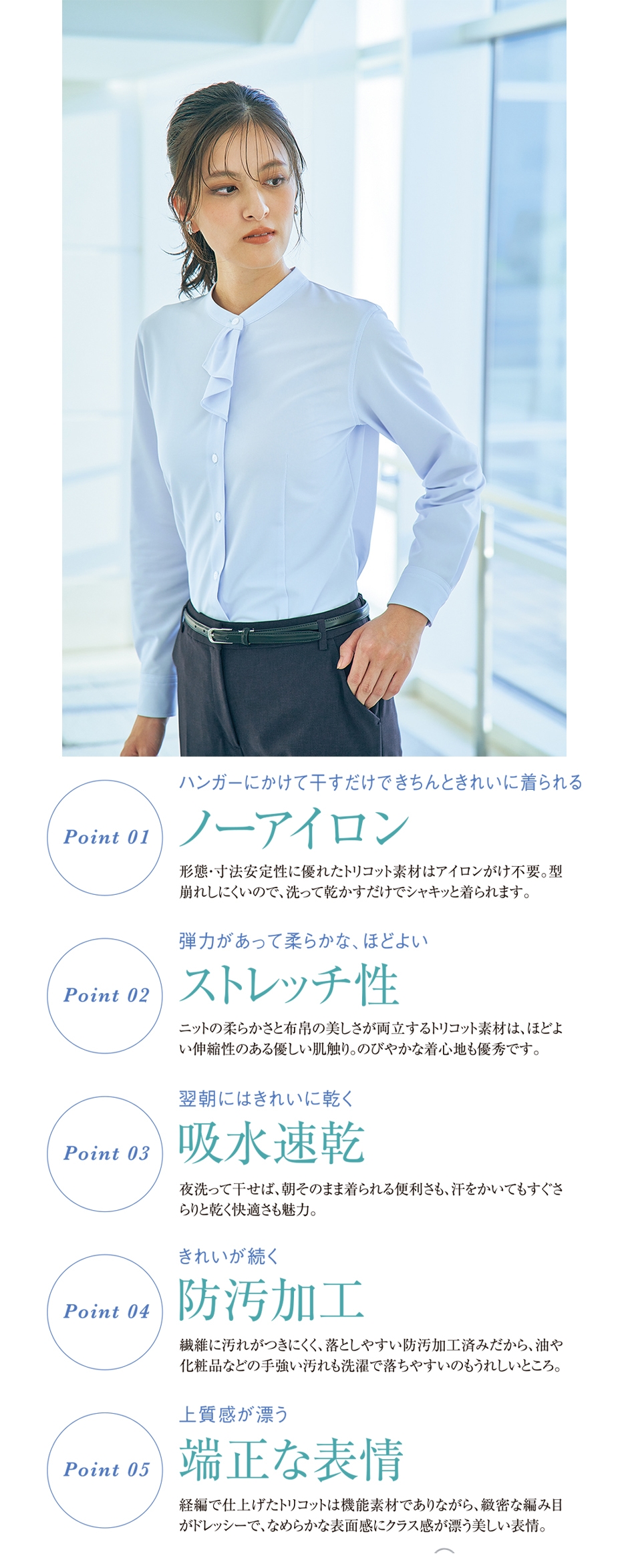 アイロン不要できちんと美しい、高い形態安定性を持ちながら肌触りは柔らかく滑らかで、緻密な編み目が上質な雰囲気。洗濯しても生地の張り感やシルエットが崩れにくく、ほどよいストレッチ性(伸縮性)や吸汗速乾仕様など、とことん便利に心地よいブラウスに仕上げました。繊維に汚れがつきにくく、落としやすい防汚加工も施してあり、油や化粧品などの手ごわい汚れも洗濯で落としやすいこともうれしいポイントです。経編で仕上げたトリコットは機能素材でありながら、緻密な編み目がドレッシーで、クラス館が漂う美しい表情のため、ユニフォームとして最適です。北陸産のこだわり素材のブラウスをぜひどうぞ!