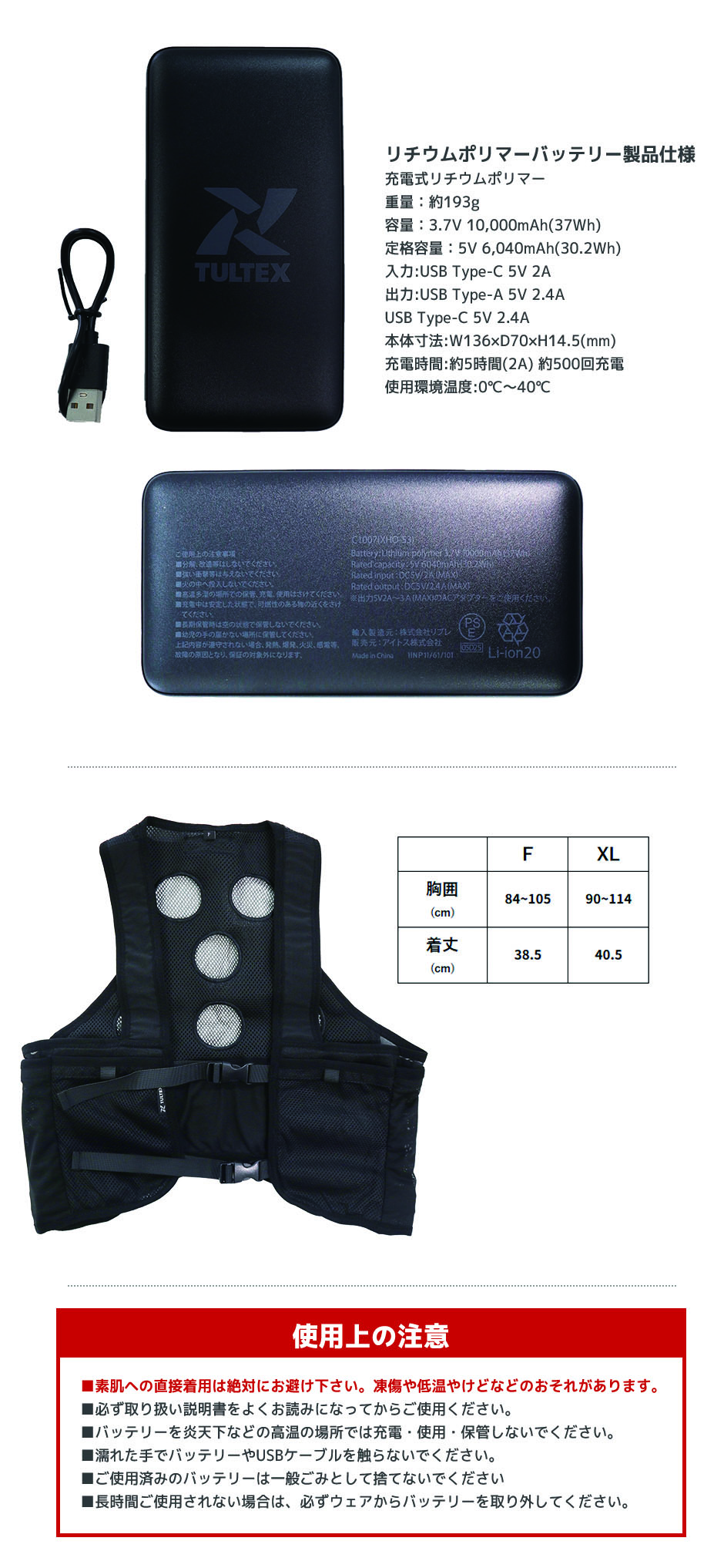 | ■素肌への直接着用は絶対にお避け下さい。凍傷や低温やけどなどのおそれがあります。 ■必ず取り扱い説明書をよくお読みになってからご使用ください。 ■バッテリーを炎天下などの高温の場所では充電・使用・保管しないでください。 ■濡れた手でバッテリーやUSBケーブルを触らないでください。 ■ご使用済みのバッテリーは一般ごみとして捨てないでください ■長時間ご使用されない場合は、必ずウェアからバッテリーを取り外してください。 |