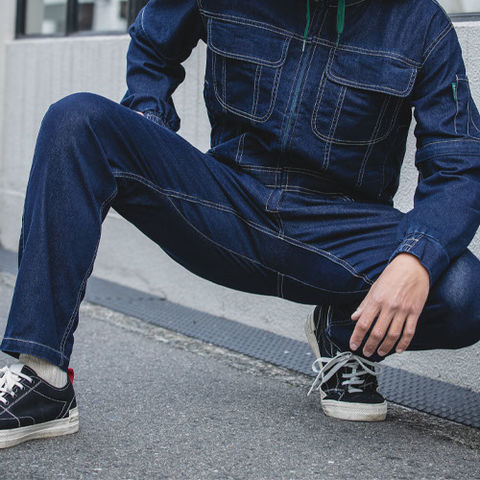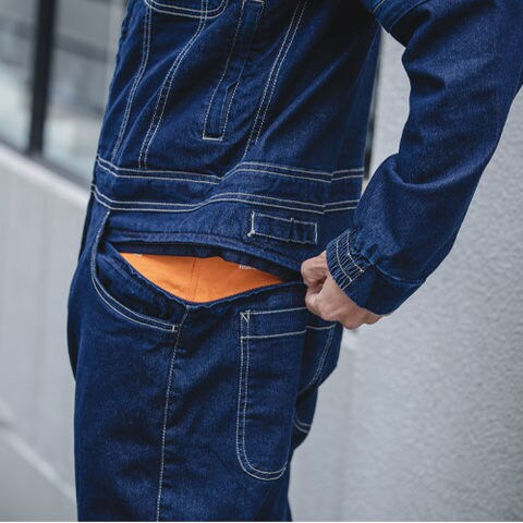 | ツナギやサロペットの最大のネガティブポイントであった、お手洗い時の問題がクリアになったストレスフリーな便利機能。腰周りのファスナーで簡単に開閉ができてヒップオープンになるので、上着部分を脱がずに用が足せます。 |