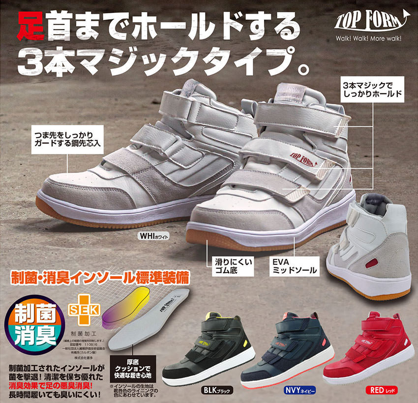 | 足首までホールドする3本マジックタイプ。制菌・消臭インソール標準装備。つま先をしっかりガードする鋼先芯。滑りにくいゴム底。EVAミッドソール |