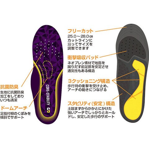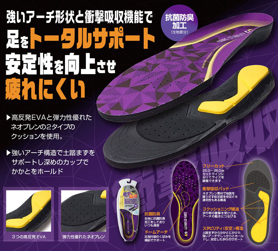 | ・強いアーチ形状と衝撃吸収機能で足をトータルサポート! ・ネオプレン素材で地面を蹴りだす前足部を安定させ通気孔を設けることで通気性に優れムレにくい! ・スタビリティ(安定)構造を採用することで土踏まずからカカトにかけた強いアーチでしっかりとホールドし安定した歩行のサポートをします。 ・高反発EVAと弾力性に優れたネオプレンの2タイプのクッションを採用することでクッション性が良いです。 ・カカト部分は深めのカップでしっかりホールドすることで靴内のズレを防ぎます。 ・インソール本体にカットラインがあるためサイズカットも楽々! ・抗菌・防臭加工 |
