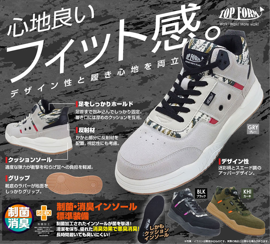 | ・心地よいフィット感と適度な弾力で衝撃を軽減するクッションソールを搭載したセーフティースニーカーです。 ・両側面に空気穴を配置することでムレを軽減します。 ・アッパーは迷彩柄とスエード調のデザインです。 ・クッション性に優れたEVAミッドソール採用しています。 ・白金ナノ加工された制菌・消臭インソールの生地が菌を撃退!清潔を保ち、消臭効果で足の悪臭消臭 長時間履いても臭いにくいです。 ・アウトソールは前面ラバーで地面をしっかりグリップします。 ・カカト部分には、視認性の高い反射材採用で夜間作業の安全を確保します。 |