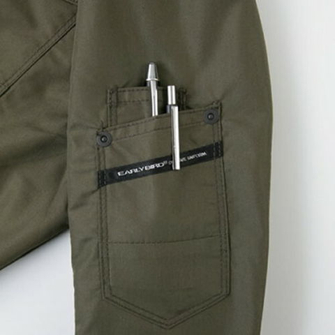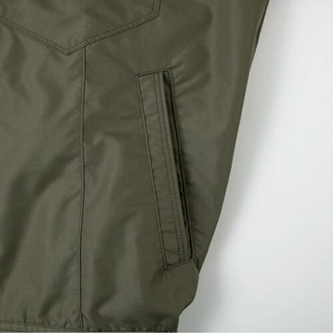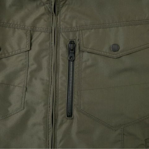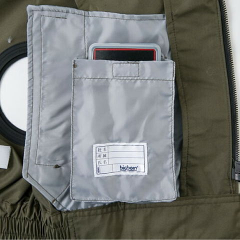 | 首調整ヒモ、左胸ファスナーポケット、両脇逆玉ポケット、左袖ペン差し、保冷剤メッシュポケット、ファン用リング、袖口Wドットボタン、左内側ボックスポケット |