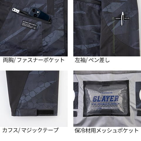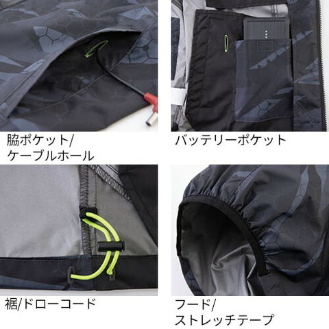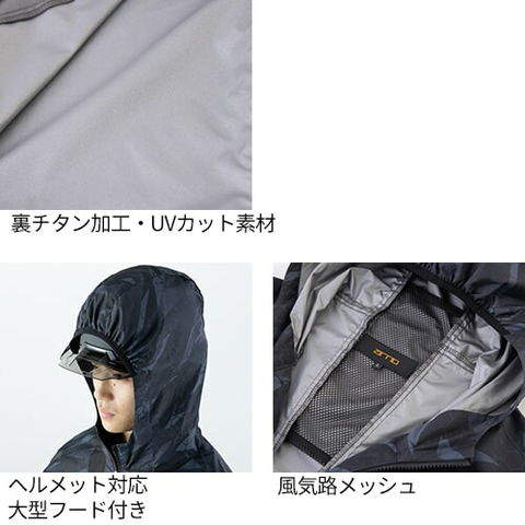 | 裏チタン加工・UVカット素材、ヘルメット対応大型フード付き、風気路メッシュ、保冷材用メッシュポケット |