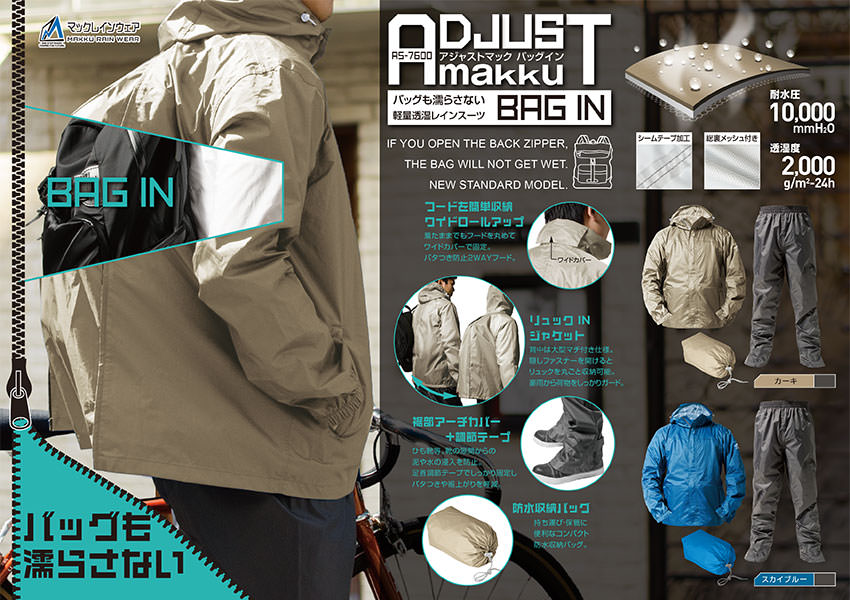 | 背中の大型マチ付き仕様でバッグIN。バッグも濡らさない軽量透湿レインスーツ |
