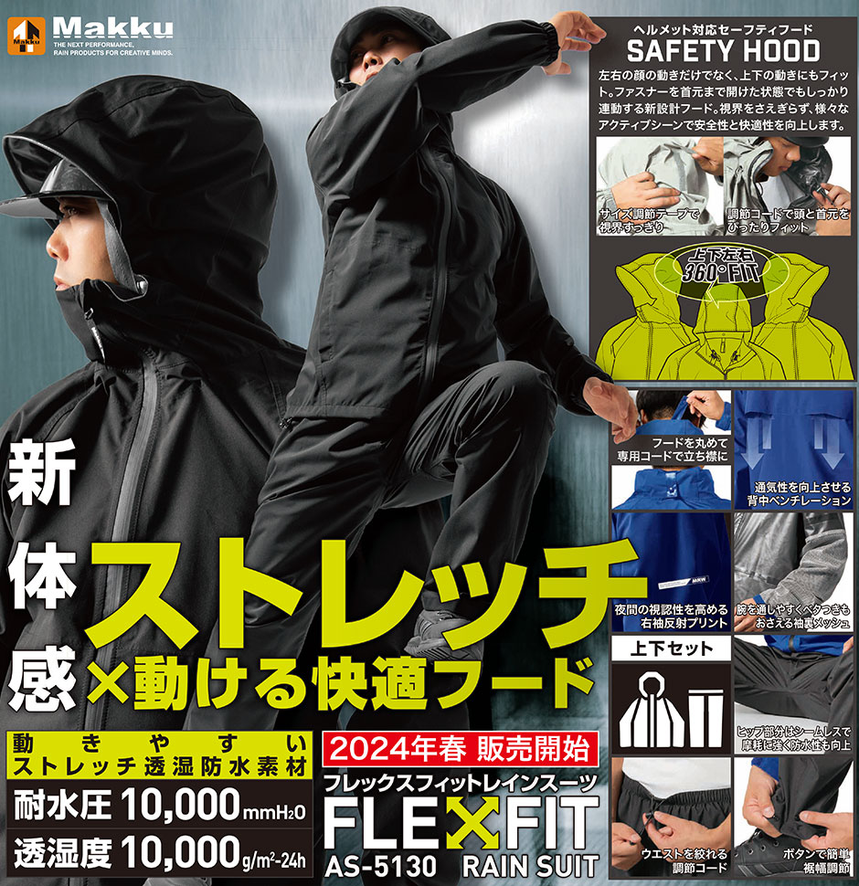 合羽 上下セット Makku マック フレックスフィットレインスーツ AS-5130 レインウエア 合羽 カッパ はっ水 撥水 防水 シームテープ加工 背中ベンチレーション フード 反射材 大きいサイズ