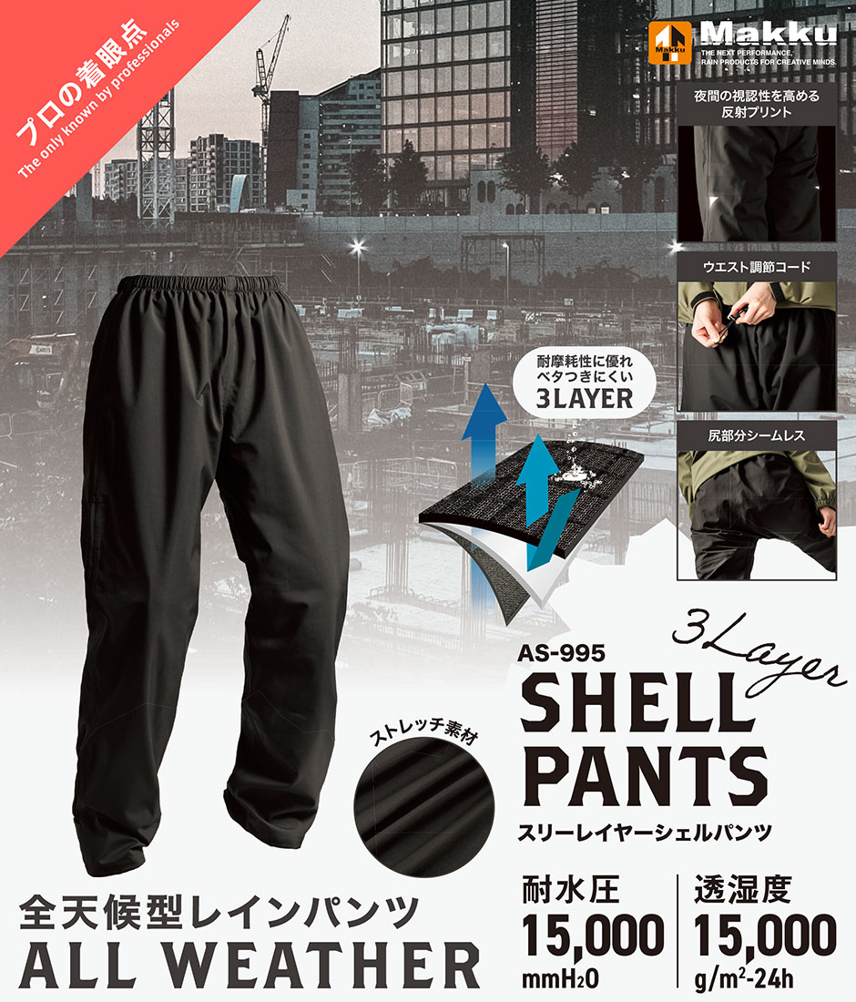 レインパンツ Makku マック スリーレイヤーシェルパンツ AS-995 レインウエア 合羽 カッパ 雨の日 屋外作業 建築 建設 土木 工事 警備 農業 林業 漁業 ペンキ塗り 塗装 通勤 通学 自転車 バイク アウトドア フェス フィッシング 釣り つり スポーツ観戦 スポーツ キャンプ ト