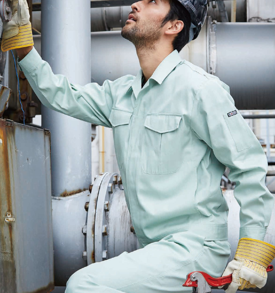 | 火を使う仕事にも心強い綿100%のワークウェア ・日本製素材使用 ・火を使う現場でも安心な綿100%素材使用 ・安心のベーシックデザインシリーズ |