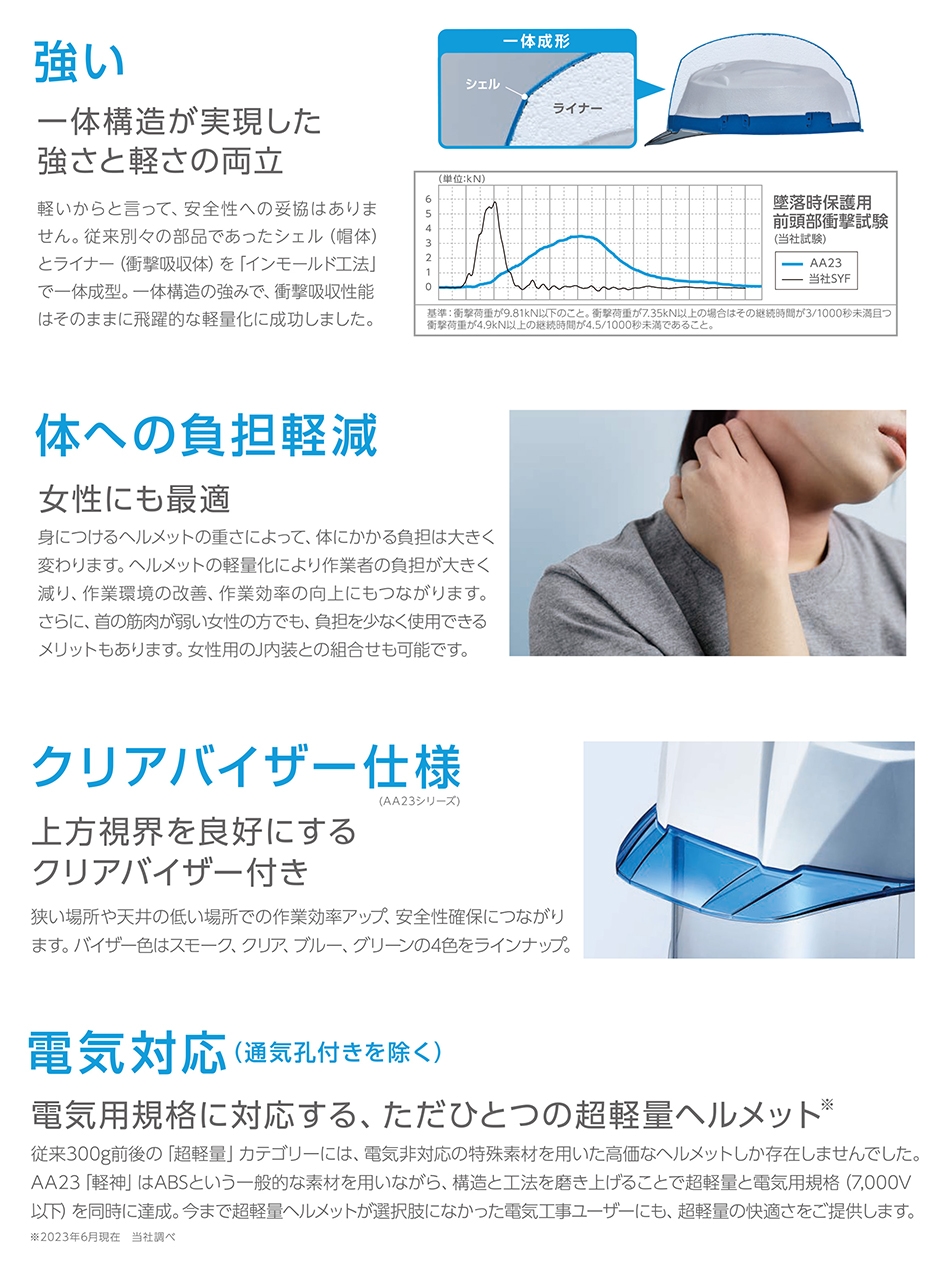 | 「軽神」シリーズとして新たにクリアバイザーヘルメットが誕生しました! 従来別々の部品であったシェル(帽体)とライナー(衝撃吸収体)を「インモールド工法」で一体成型させた強みで、衝撃吸収性能はそのままに飛躍的な軽量化に成功しました。 ヘルメットの軽量化により作業者の負担も大きく減り、作業環境の改善、作業効率の向上にもつながります。女性の方でも負担少なく使用することができます。 従来300g前後の超軽量カテゴリには、電気非対応の特殊素材を用いた高価なヘルメットしか存在しませんでしたが、今回の商品では構造と工法を磨き上げることにより、超軽量と電気用規格(7000V)を同時に達成しました。 上方視界を良好にするクリアバイザーの色はスモーク、クリア、ブルー、グリーンの4色をラインナップ。 |