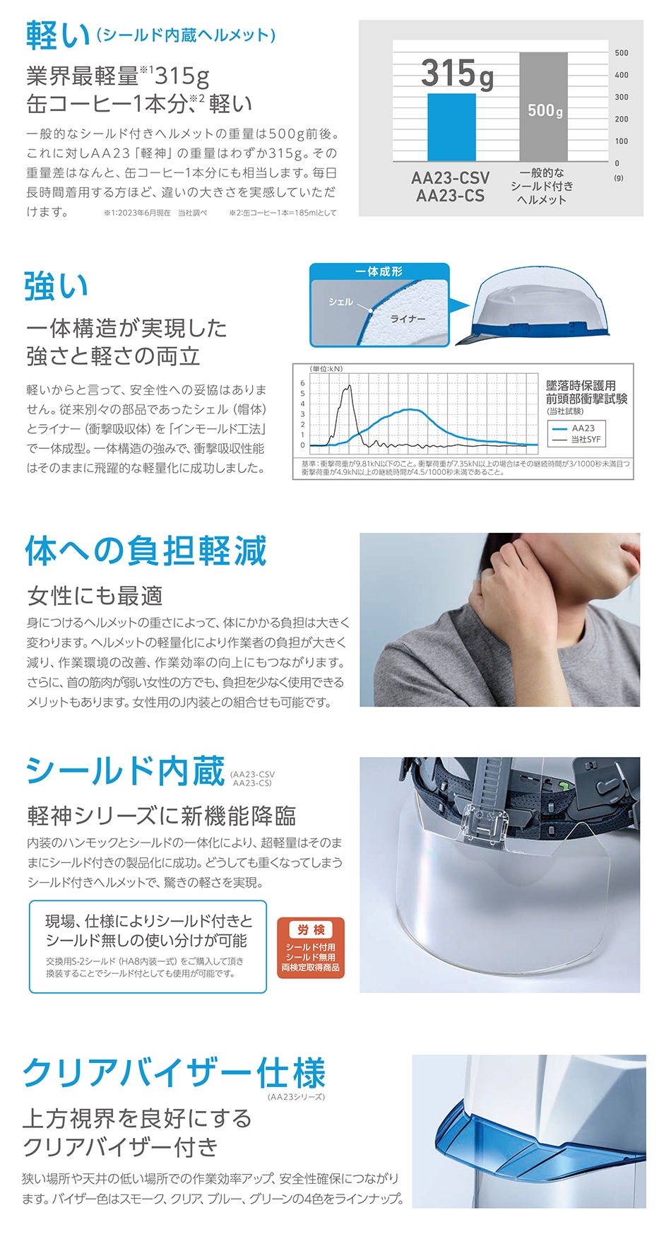 クリアバイザー仕様ですので、狭い場所や天井の低い場所での作業効率アップ、安全性確保にも貢献します。