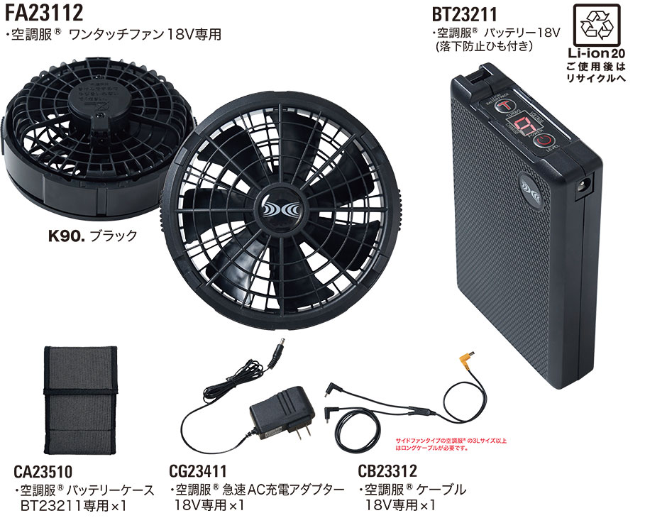 | ※18V専用ファンFA23112をご使用になる場合は必ず対応バッテリーBT23211、対応ケーブルCB23311、CB23312をご使用ください。 ※バッテリーBT23211はファンFA23112専用バッテリーです。既存ファンとの互換性はありません。充電の際は専用アダプターCG23411をご使用ください。 ※サイドファン3L以上はロングケーブルをご使用ください。 |