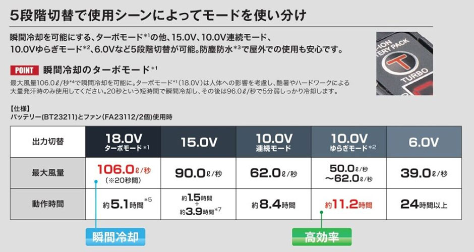 最強ファンバッテリー。最大電圧18V、最大風量106L/秒