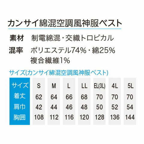大川被服 服のみ 涼しい 熱中症対策 空調風神服 カンサイ 綿混ベスト K1005 作業着 作業服 春夏 2020年春夏新作 帯電防止 kansai uniform メンズ