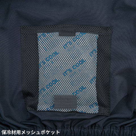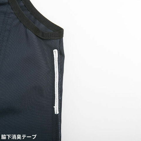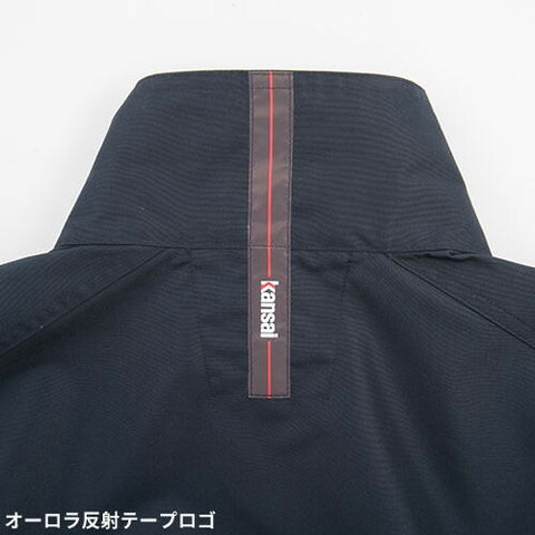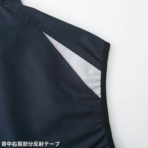 空調風神服 ベストタイプ、立ち襟仕様、オーロラ反射テープロゴ、ストレッチ袖口、保冷剤用メッシュポケット、脇下消臭テープ、左内側ボックスポケット