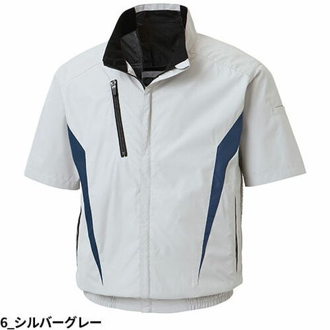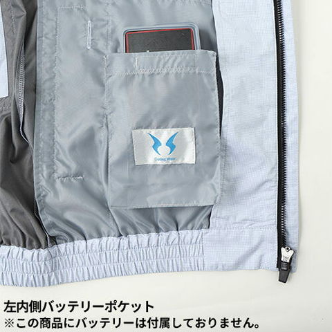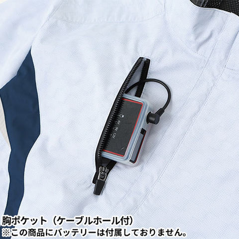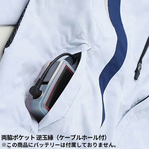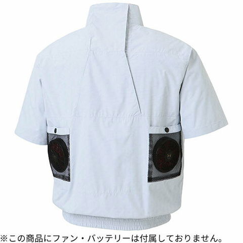 空調風神服 半袖タイプ、立ち襟仕様、胸ポケット(ケーブルホール付き)、両脇ポケット逆玉縁(ケーブルホール付き)、保冷剤用メッシュポケット、ファン脱落防止ネット、左内側バッテリーポケット、総ゴム仕様