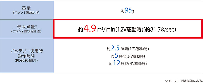 ●最大風量(ファン2個の合計値):約4.9m3/min(12Vく同時)(約68.3l/sec)